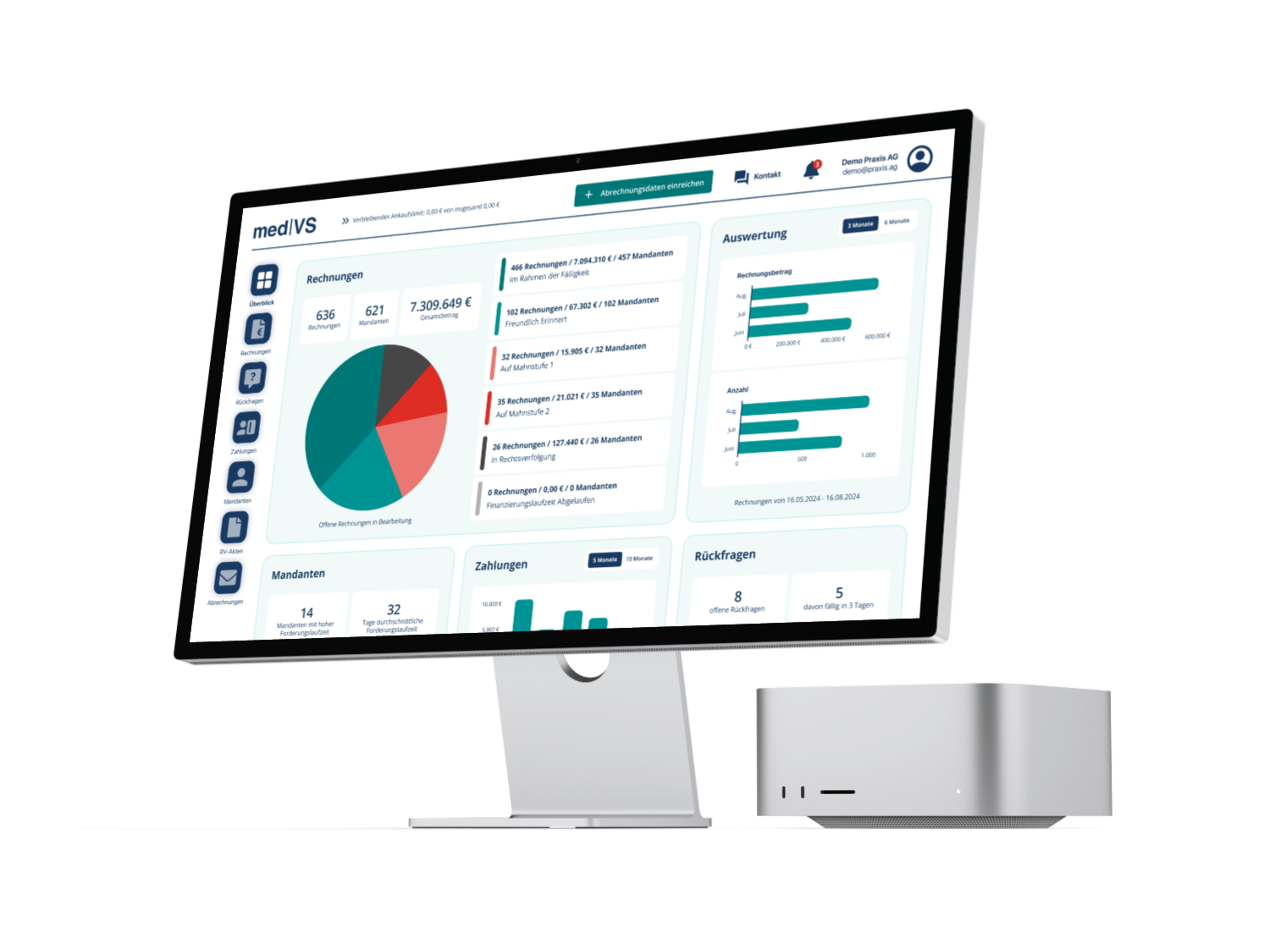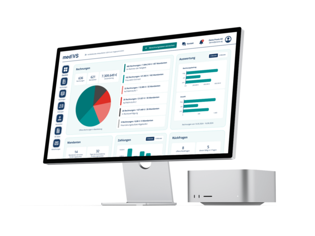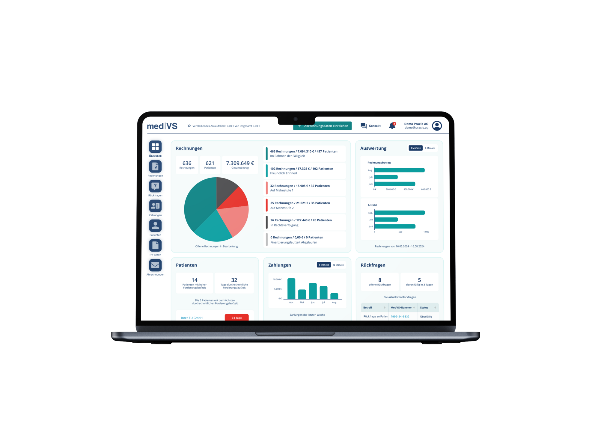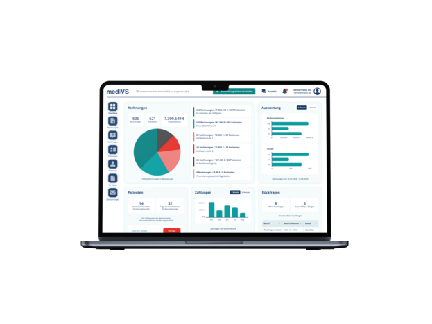 Das medCockpit bietet Ihnen einen umfassenden Überblick über alle relevanten Kennzahlen, einschließlich Auswertungen zu Zahlungen, Umsätzen und Mahnstufen.