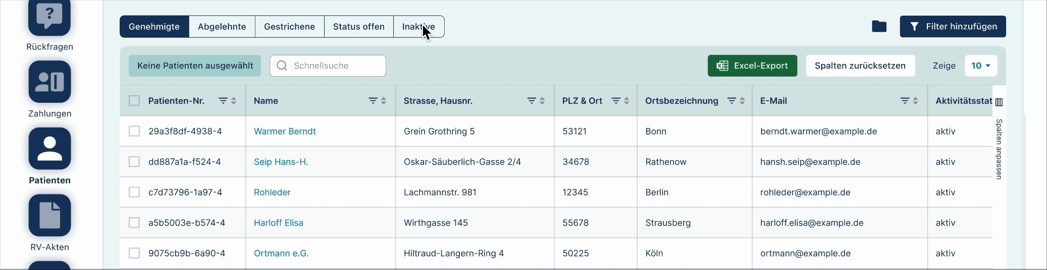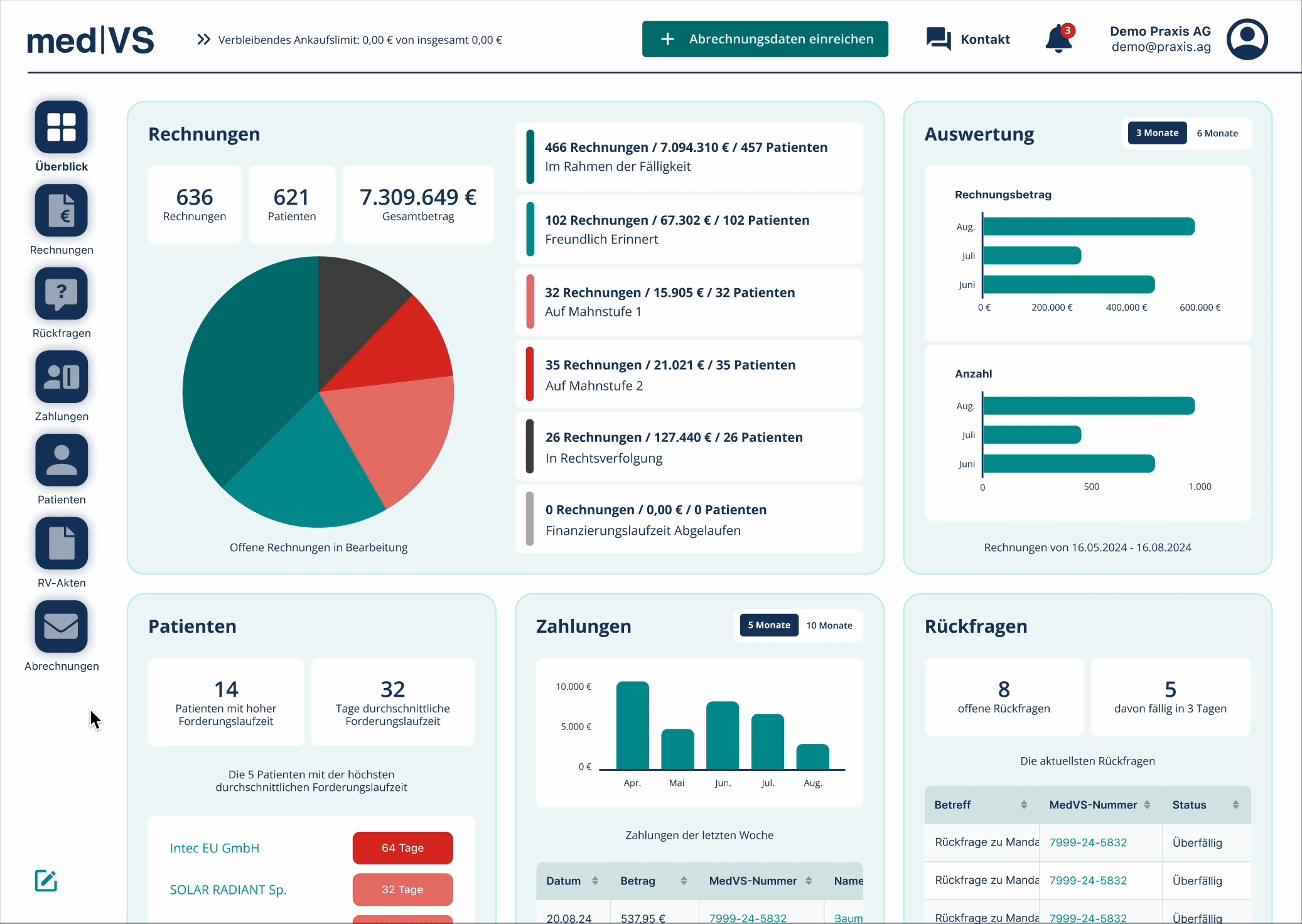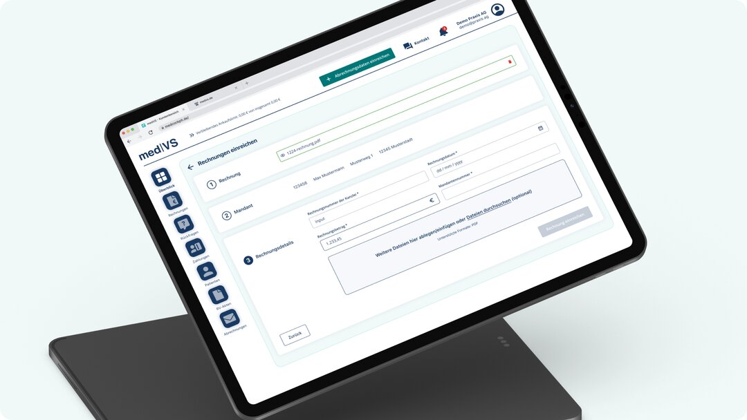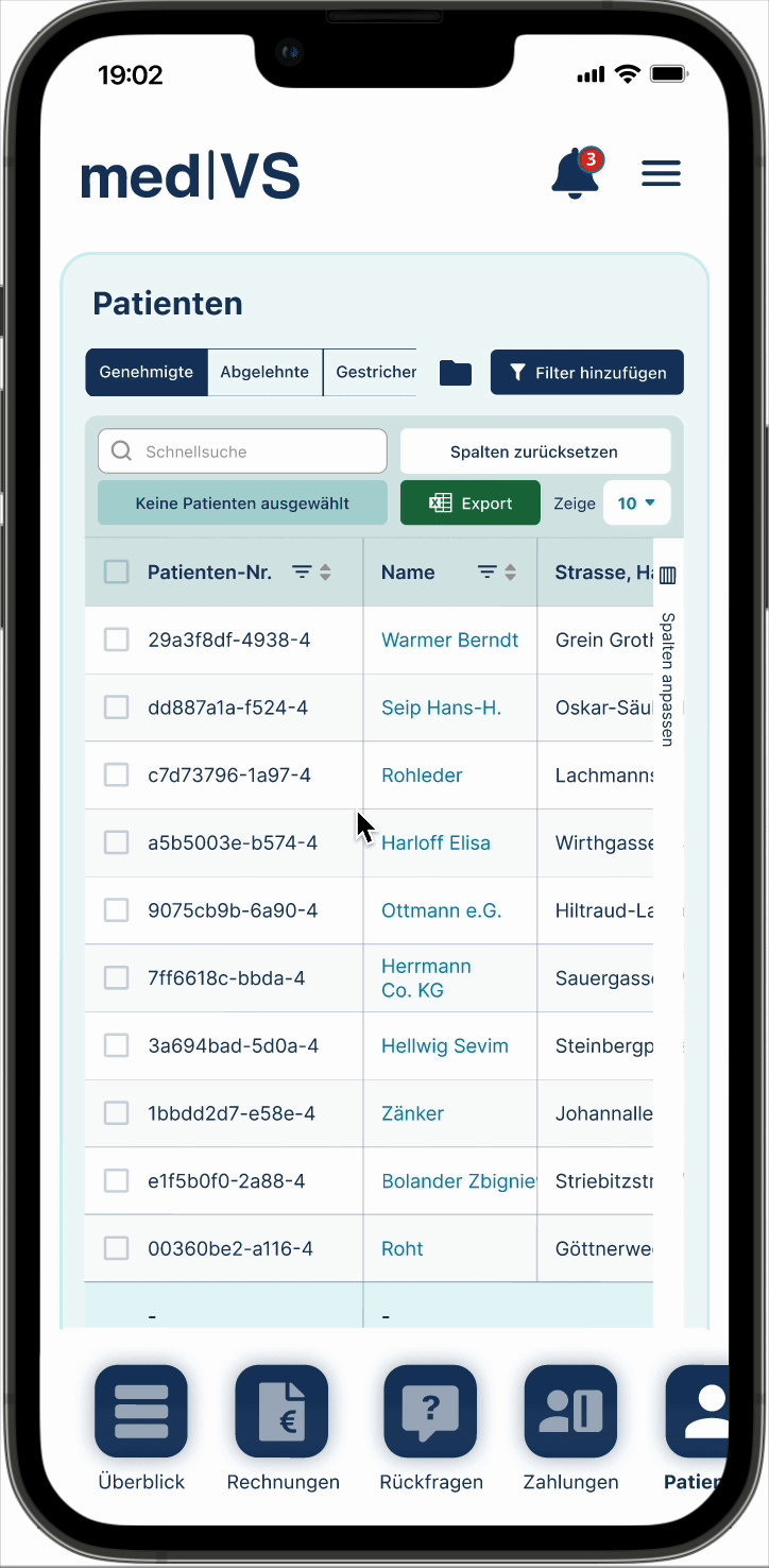 – Schnellzugriff auf wichtige Funktionen der jeweils aufgerufen Seiten permanent in der oberen Navigationsleiste (Aktionen: Rechnung einreichen, Patient hinzufügen unter Menüpunkt Patienten und Nachricht an uns unter Menüpunkt Rückfragen)