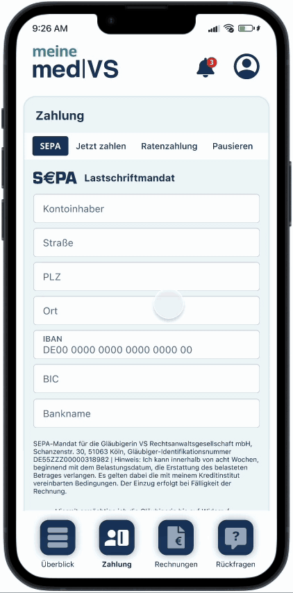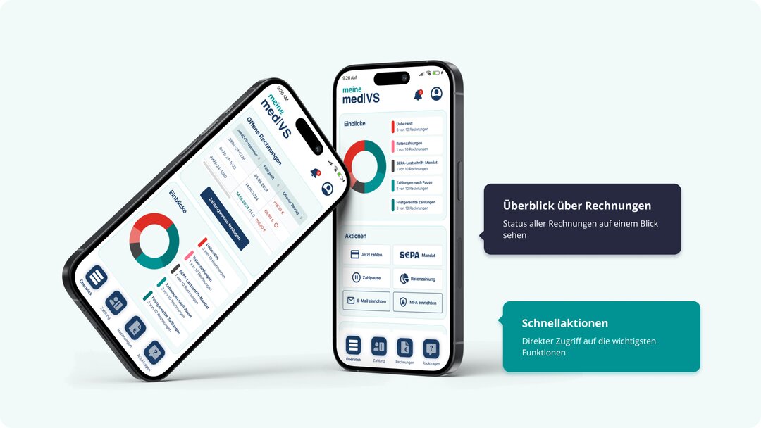 Laden Sie sich „meine MedVS“ direkt im App Store oder bei Google Play herunter – und profitieren Sie jederzeit und überall von einem einfachem Zugriff auf Ihre Rechnungen, flexiblen Zahlungsoptionen, Echtzeit-Benachrichtigungen und einer komfortablen Verwaltung.